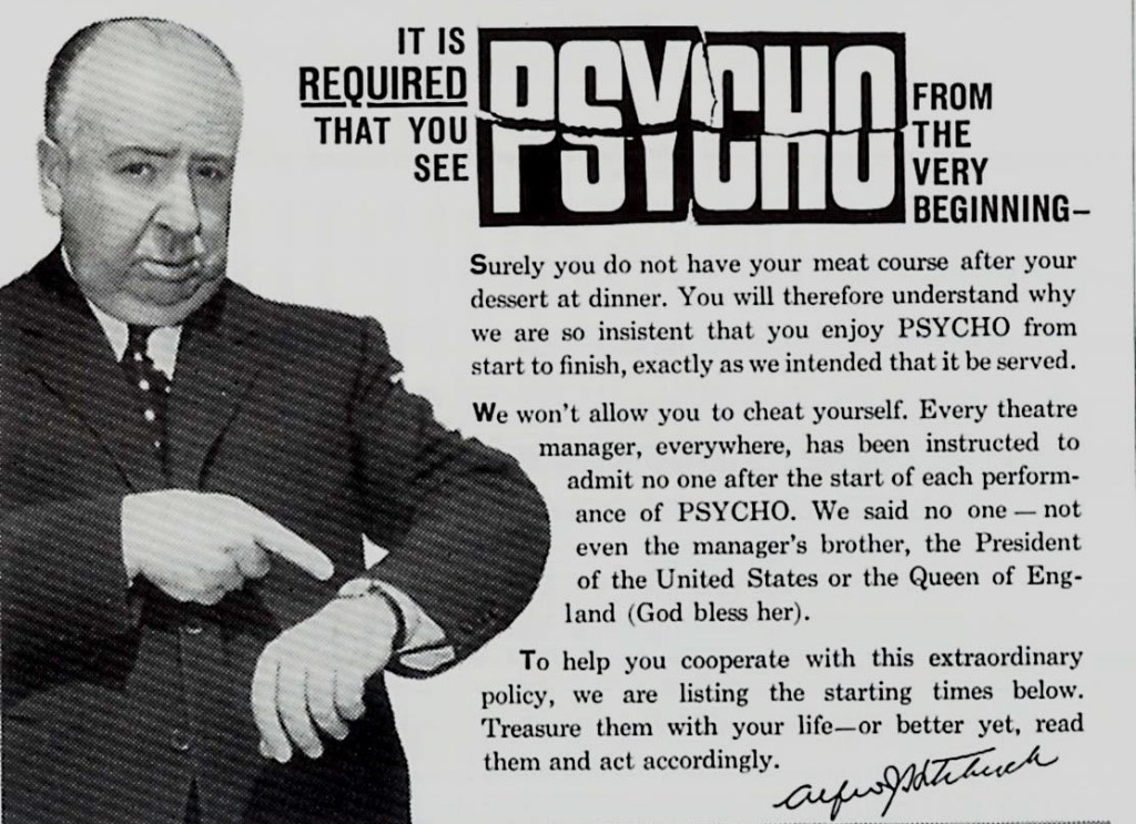 Even viewers at the time were unfamiliarly restricted—before ‘Psycho’, films ran continuously in theaters, the audience free to come and go throughout. But Hitchcock harangued theaters into not allowing latecomers into ‘Psycho.’ This created an initial sense of tension for audience goers—be here on time, sit down, and strap in for what you’re about to see.