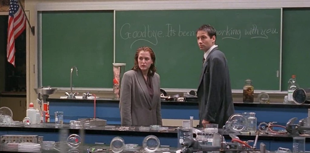 Mulder arrives at the school and finds Scully, who’s all “I didn’t call you to come rescue me…for once.”