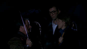 Meanwhile, the PTC3 gets all conspiratorial outside in the rain under their conspiracy umbrellas.