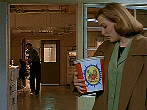 Moving on! Scully meets up with Mulder at the local morgue. She has a giant tub of Chaco chicken under her arm. Uh….Scully, why do you have that? Please don’t tell me this is your lunch. With everything you’ve seen here, why the fuck would you even think of ordering Chaco chicken?