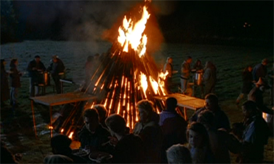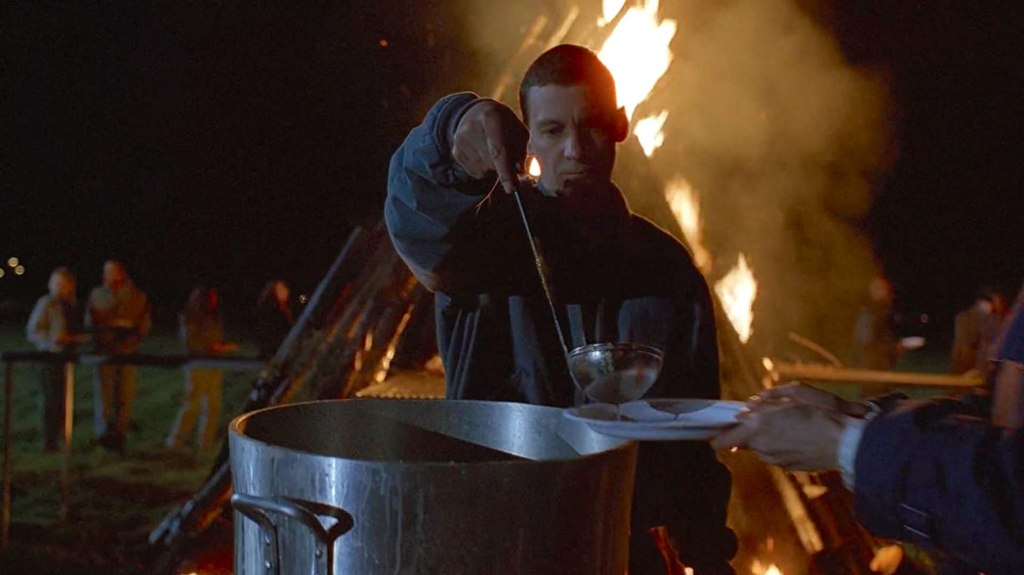 We cut to an open field where the townspeople are standing in line with paper plates around a big bonfire. Yeah, I don’t think they’re here to sing Kumbaya. None other than Dr. Randolph is ladling out their servings of Mrs. Kearns Surprise.
