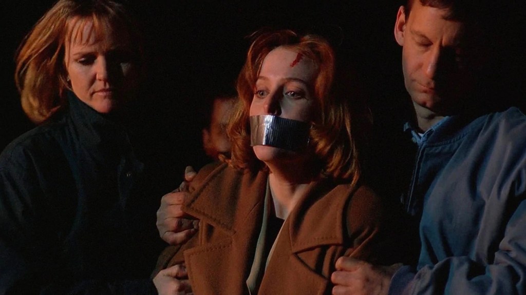 Mulder frees Scully. “Are you hurt?” No, Mulder, just horrifically traumatized for the hundredth time.