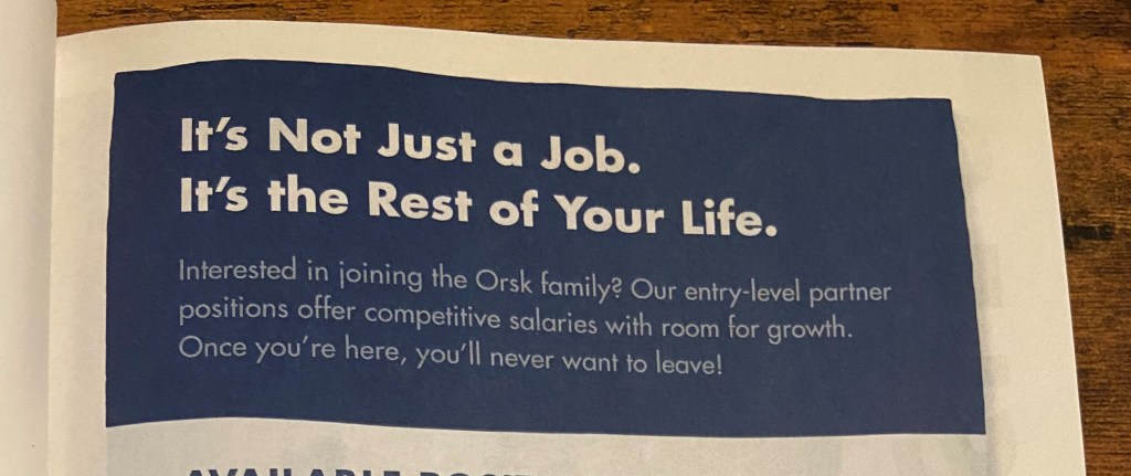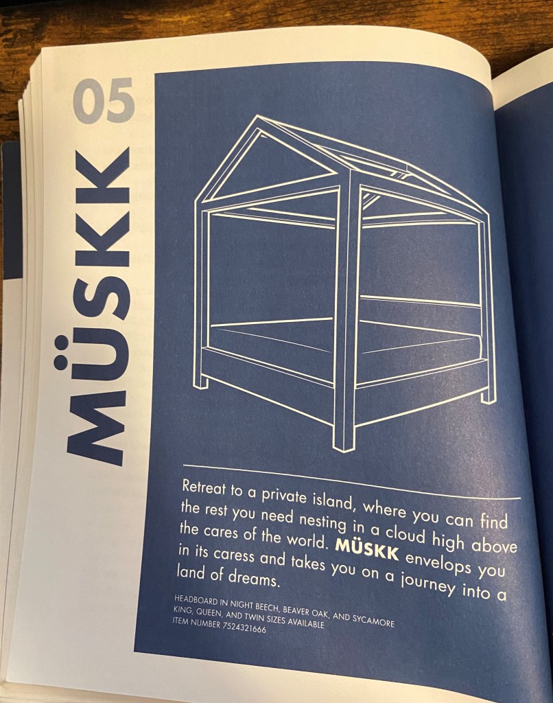 The Orsk “lifestyle” is complete with Scandinavian-sounding, but utter gibberish names for everything from your Brooka lounging sofa to your sensible Liripip wardrobes. Häagan-Daz, eat your heart out. And yes, the brand’s favorite phrase is ‘Got a Question? Just Orsk!’ Based on that alone, I know that I would stab my own eardrums out with a spare hex key wrench if I worked somewhere like this. Which is the author’s intent.