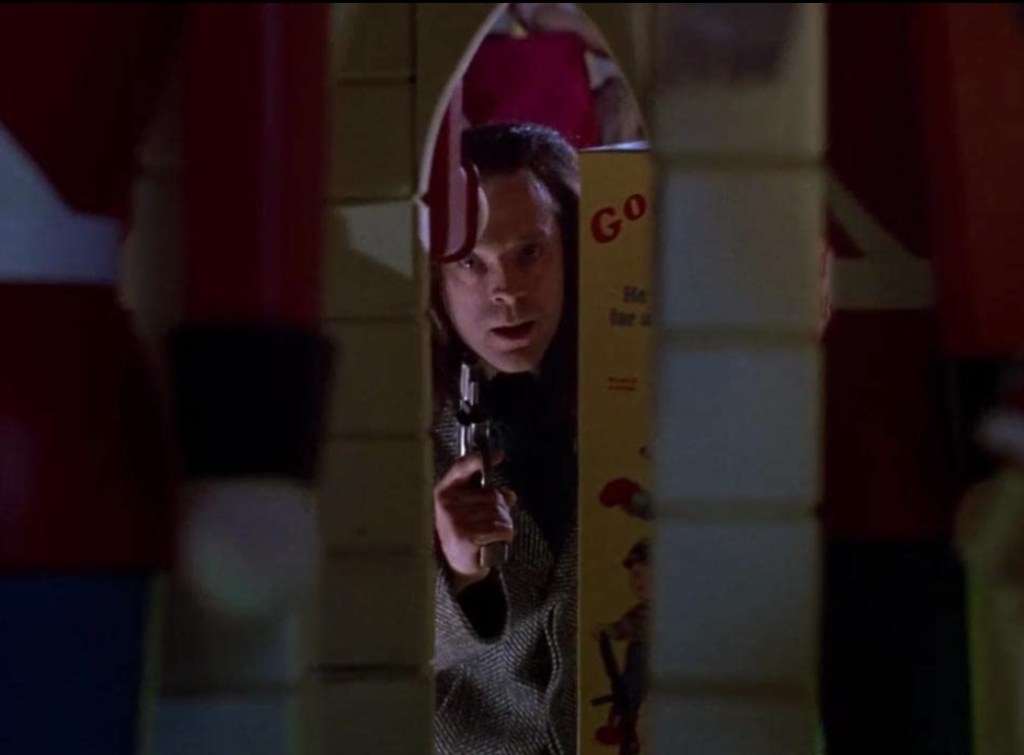 Among brightly colored shelves of toys, the detective and the killer trade bullets once more. Det. Norris shoots Charles Lee Ray again, this time in his side. Ray stumbles deeper into the toy store, leaving a trail of blood.