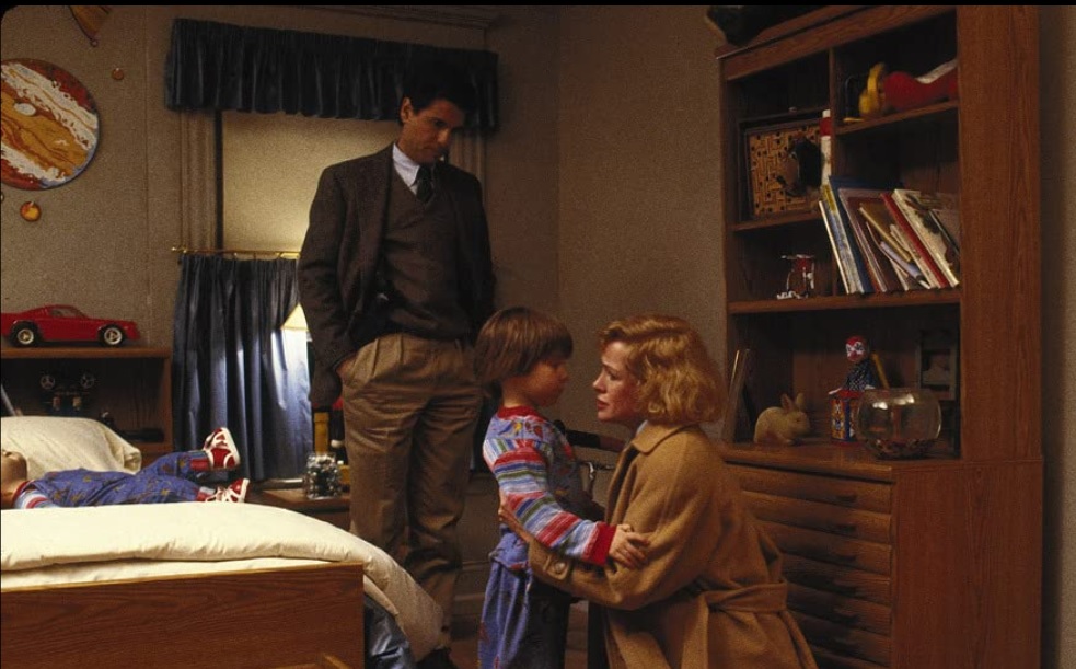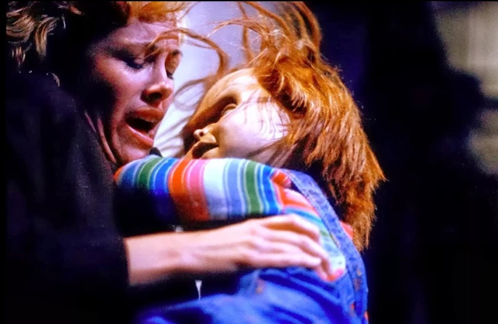Karen then remembers that they have fucking guns. She starts shooting at Chucky. Again, in tribute to The Terminator (released 4 years previous), Chucky continues stepping forward. She shoots his head off. The body keeps coming. She shoots off an arm. He keeps coming. It’s the Black Knight from Monty Python all over again.