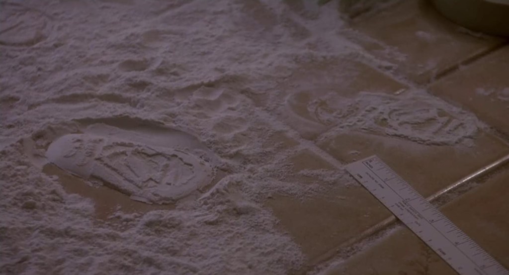 After ruffling little Andy on the head like he doesn’t suspect the tot of murder, Detective Norris shows Karen the scene in the kitchen. There are little footprints in the flour spilled on the counter and the floor. Footprints that perhaps were left by a tot who committed the murder!