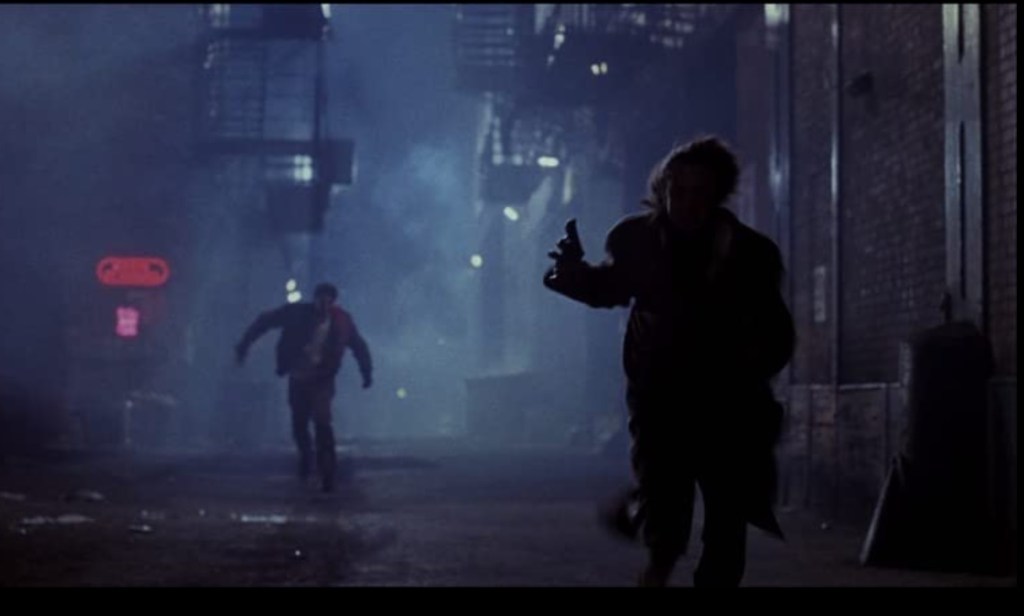 The Lake Shore Strangler is wearing a suit and tie under that trench coat, which throws me. What was he doing when this police chase started? Does Charles Lee Ray have some lame day job like an accounting clerk? Was he about to enter his favorite deli thinking ‘I’d strangle a woman for an everything bagel with lox right about now’ when Detective Norris spotted him?