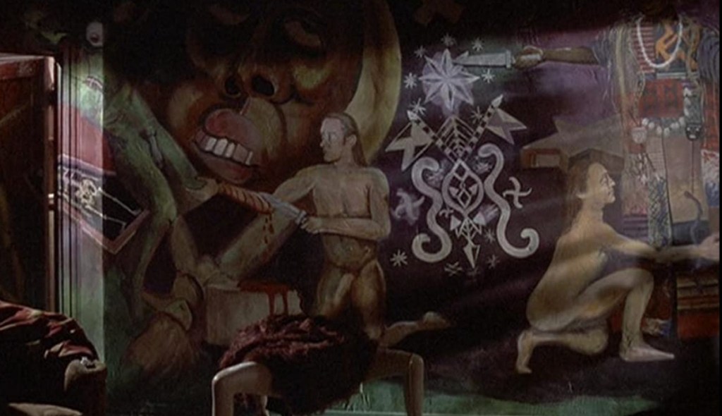 Quite the artiste, Charles Lee Ray painted elaborate murals on his walls. I guess security deposits don’t matter so much when you’re a dark wizard and serial murderer. Many images are of a naked (ick) Charles Lee Ray performing various bloody rituals.