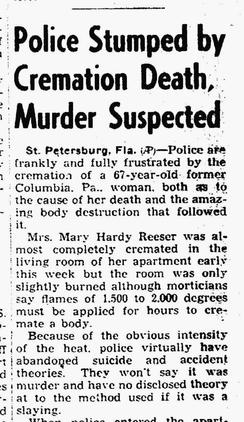 Dr. Richard Reeser Jr. was concerned for his mother. Originally from small-town Pennsylvania, 67-year old Mary Reeser had moved to St. Petersburg, Florida to be closer to her children and grandchildren after being widowed.